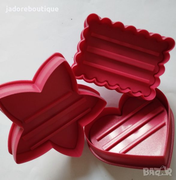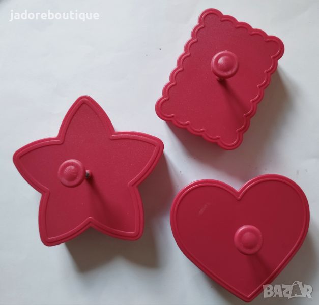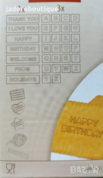 Комплектът съдържа 3 броя резци за сладки с бутало, релса за поставяне на букви, 7 броя печати думи и 88 букви ( по 3 бр от всяка буква от латинската азбука).