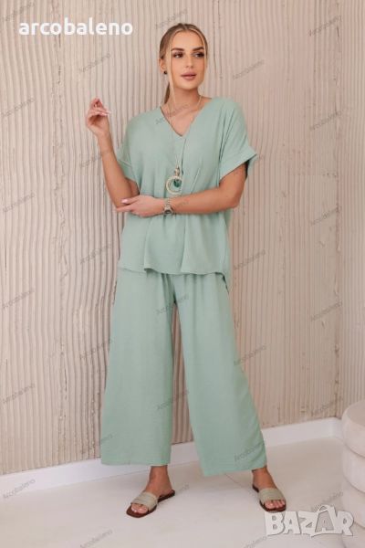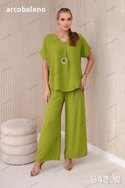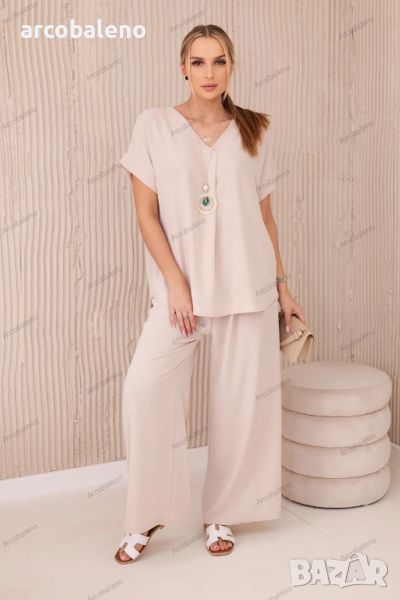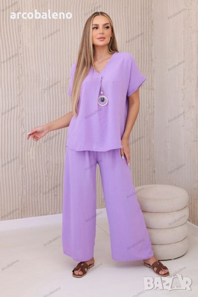 Италиански комплект от две части, състоящ се от блуза и панталон е елегантен комплект, който придава чар и стил на всеки стайлинг. Разширената блуза придава фина женственост, като подчертава фигурата и в същото време осигурява свобода на движение. Класическата кройка на панталона го прави съчетан перфектно с елегантна блуза, създавайки едно цялостно и стилно цяло. Освен това висулката е очарователен детайл, който придава оригиналност и характер на този комплект, създавайки хармонична композиция. Това е елегантен аксесоар, който подчертава уникалността и вниманието към детайла в целия стайлинг. Този италиански комплект е идеален за много поводи, от бизнес срещи до романтични срещи. Това е изискан вариант за хора, които ценят елегантността и комфорта в едно. Размерът е универсален и става за жени, носещи размер S, M или L.