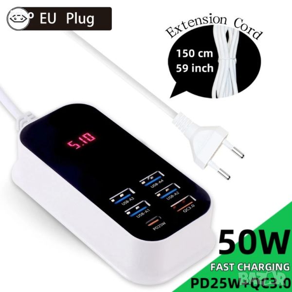 50W USB зарядно устройство 5 USB порта + 1 Type-c с LED дисплей бързо зареждане QC3.0