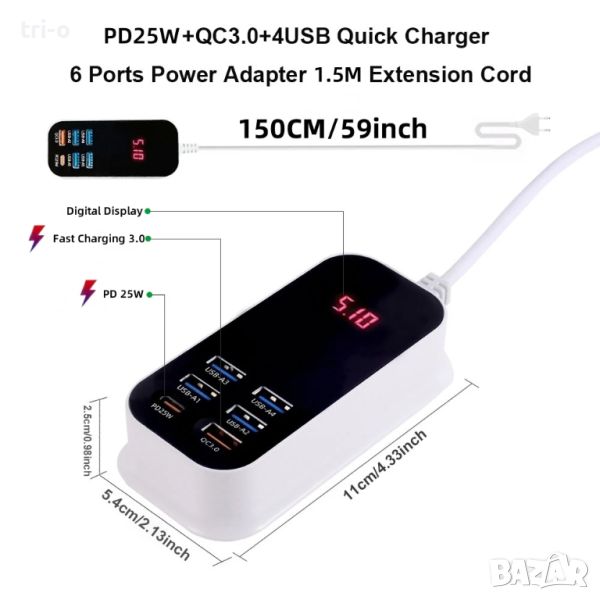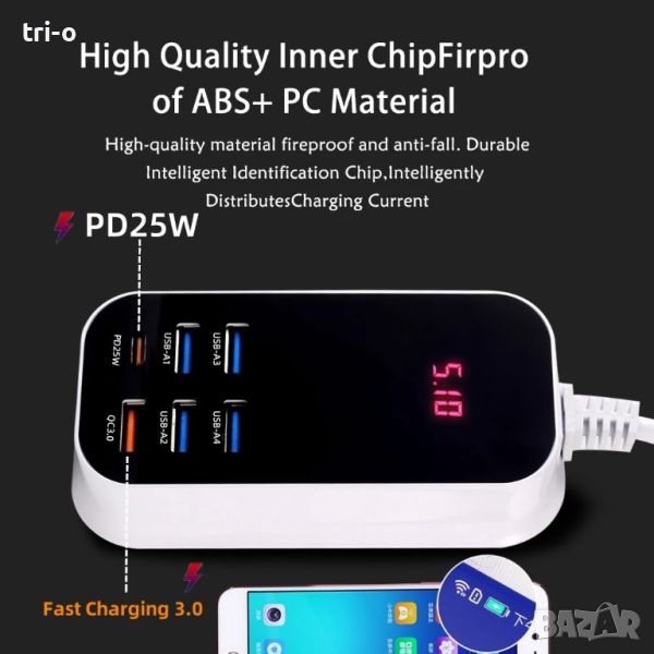 • Многопортов дизайн: Със своя 6-портов дизайн, това бързо зарядно устройство позволява едновременно зареждане на множество устройства, което значително подобрява ефективността на зареждането ви.