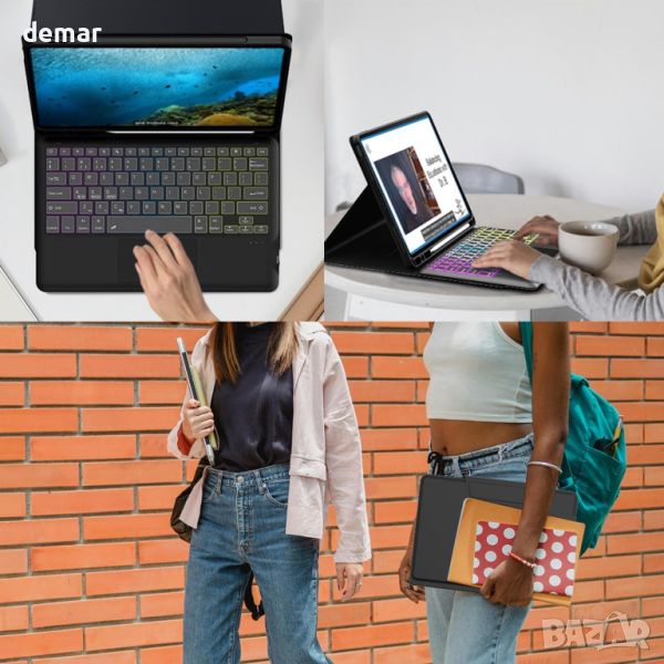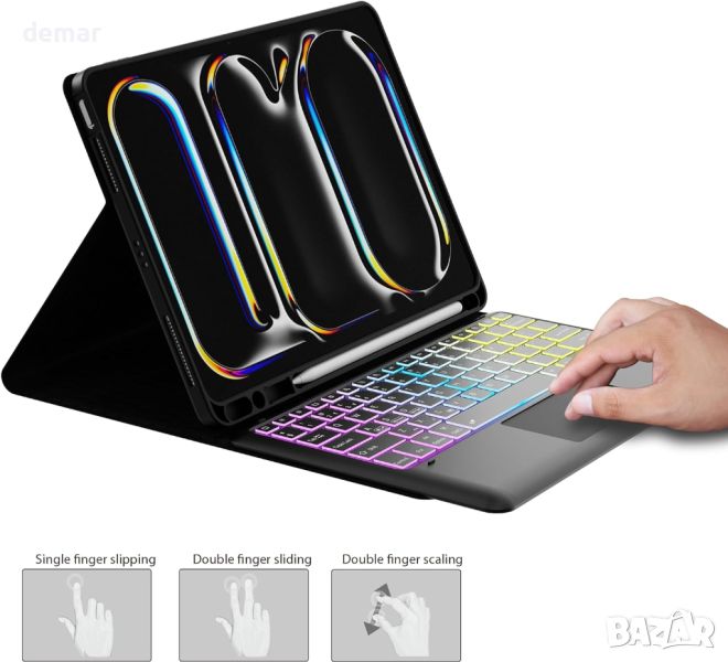 Този специално проектиран калъф за клавиатура за 2024 iPad Pro 13,0 инча M4 осигурява 3-зонова, 7-цветна клавиатура с подсветка и регулируема яркост за удобно писане при всякакво осветление. Той разполага с мултитъч тракпад за безпроблемна навигация, превръщайки вашия iPad в устройство, подобно на лаптоп. Магнитно разглобяемата Bluetooth клавиатура позволява лесно превключване между писане и използване на таблет, докато коженото покритие предлага 360° защита и включва държач за молив. С множество ъгли на гледане, той е идеален за работа, учене или забавление, което го прави универсален и практичен избор за подарък за всеки повод.