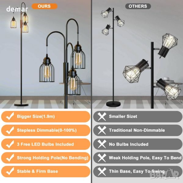 Тази черна метална подова лампа се отличава с уникален дизайн на клетка във формата на дърво, който се съчетава безпроблемно с индустриален, ретро, селски и модерен стил, добавяйки ретро чар и завладяващи светлинни ефекти. Идеален за всяка стая, той създава топла атмосфера със своята безстепенна функция за затъмняване, регулируема от 10%-100% чрез въртящ се ключ, и включва три енергоспестяващи 6W LED крушки, излъчващи топла бяла светлина при 3000K. С височина 1,9M, той е изработен от висококачествен метал със стабилна, издръжлива основа, осигуряваща безопасна употреба. Лесен за настройка за 5 минути, той е идеален подарък за всеки повод.