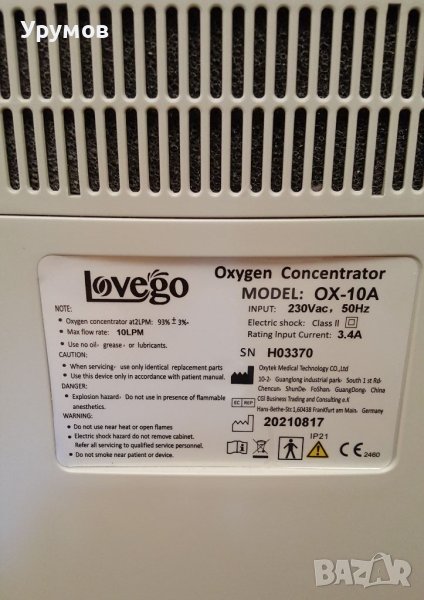 Продавам кислороден концентратор LOVEGO – модел OX10A. Уредът е закупен нов през декември 2021 година от фирма МЕДМАГ – Варна за 2780 лева /и в момента цената е такава/. Работил е само 240 часа. Концентраторът е напълно комплектован. Гаранцията е изтекла преди половин година. Предпочитам лично предаване след тест. Пътува по куриери само след предварително плащане на транспортната услуга. Цена - 1700 лв.
