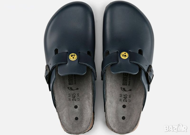 BIRKENSTOCK ESD 50-805-0543Нови , само пробвани . ESD Обувки Boston ClogsМоделът Boston ESD съчетава класически външен вид с ефективна защита срещу електростатичен разряд. Антистатичната версия на този модел предпазва както хората, така и хардуера, използван в силно чувствителни области, като например полупроводниковата индустрия.Материал на горната частЕстествена кожа, индивидуално регулируема метална катарама с щифтСтелкаЧиста хипоалергенна подметкаМатериал на хранителното леглоАнатомично легло за крака от корк и латекс с антистатична версияПодметкаEVA с антистатичен ефект.ESD защитна работна обувка, тествана в съответствие с EN 61340.