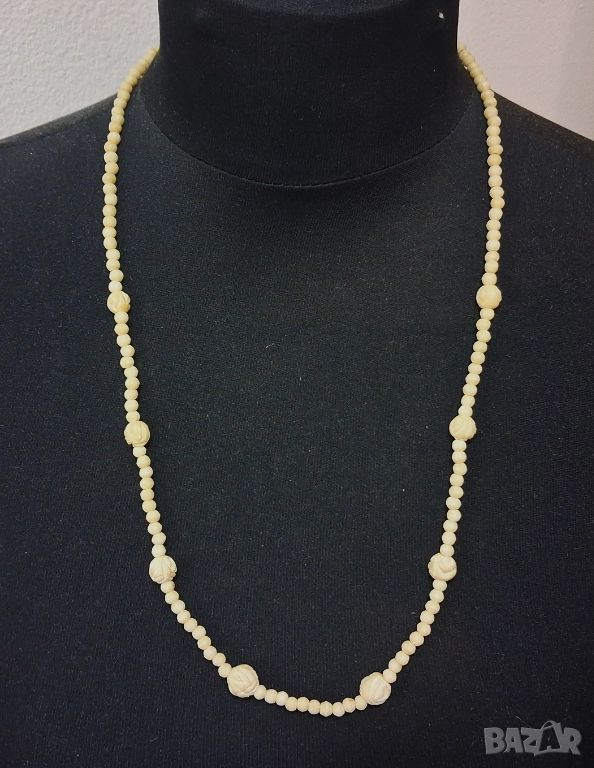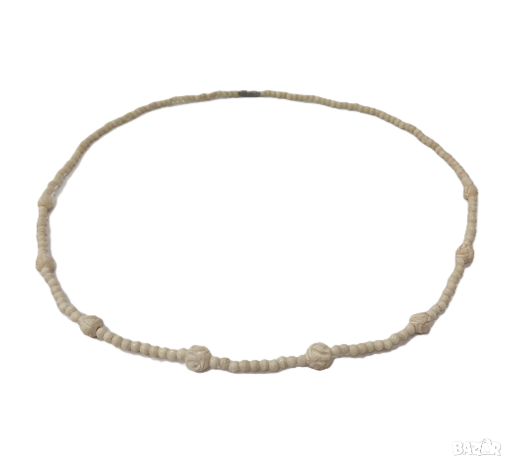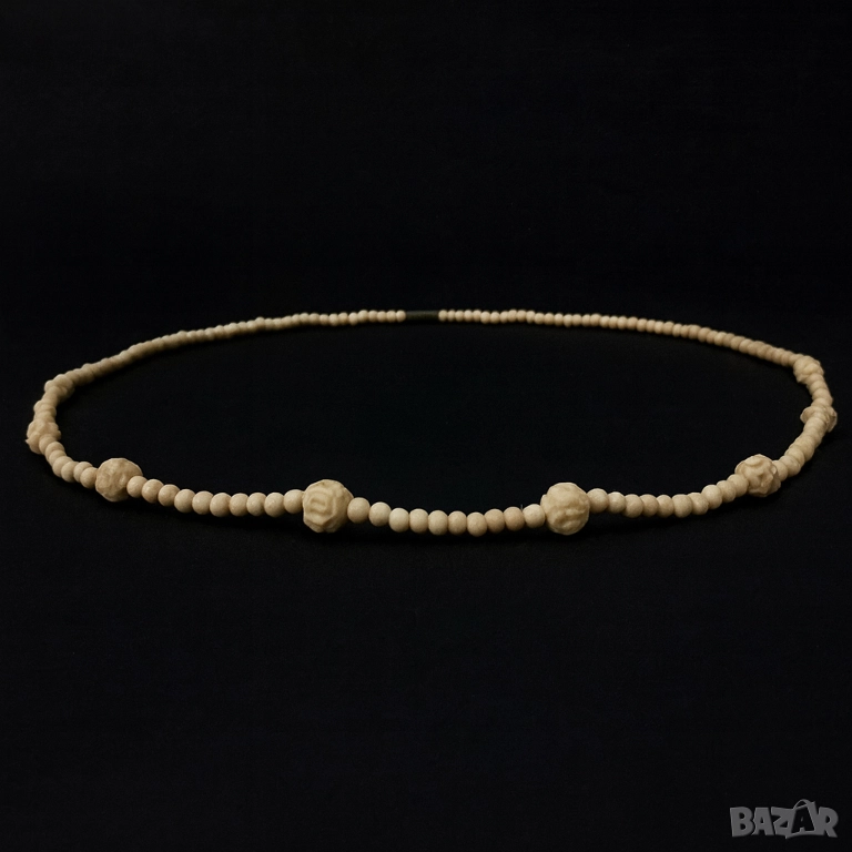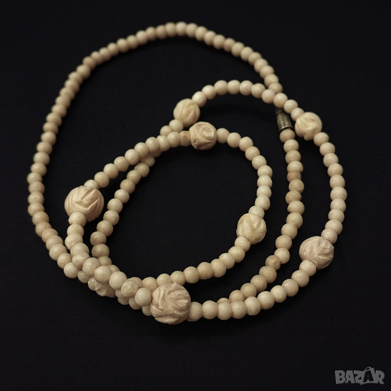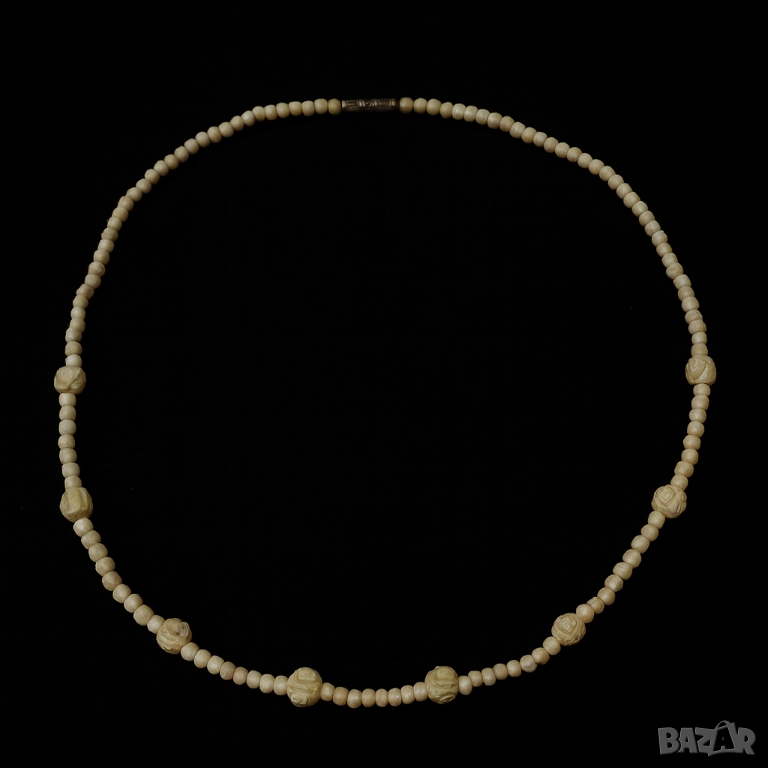 Изящна ръчно изработена огърлица, съставена от малки, равномерни мъниста с кремаво-бежов тон, изработени от слонова кост. Акцентът пада върху четири по-големи резбовани мъниста с флорални мотиви, които придават уникален характер и артистична стойност на изделието. Закопчалката е месингова, с винтов механизъм, запазена и функционална.