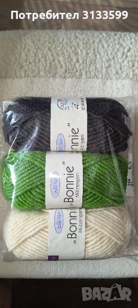 - Черна, зелена и бяла дебела прежда по 50 г всяка гранка. Състав: 30% вълна, 70% полиакрил. ЦЕНА на опаковката:10 лв.