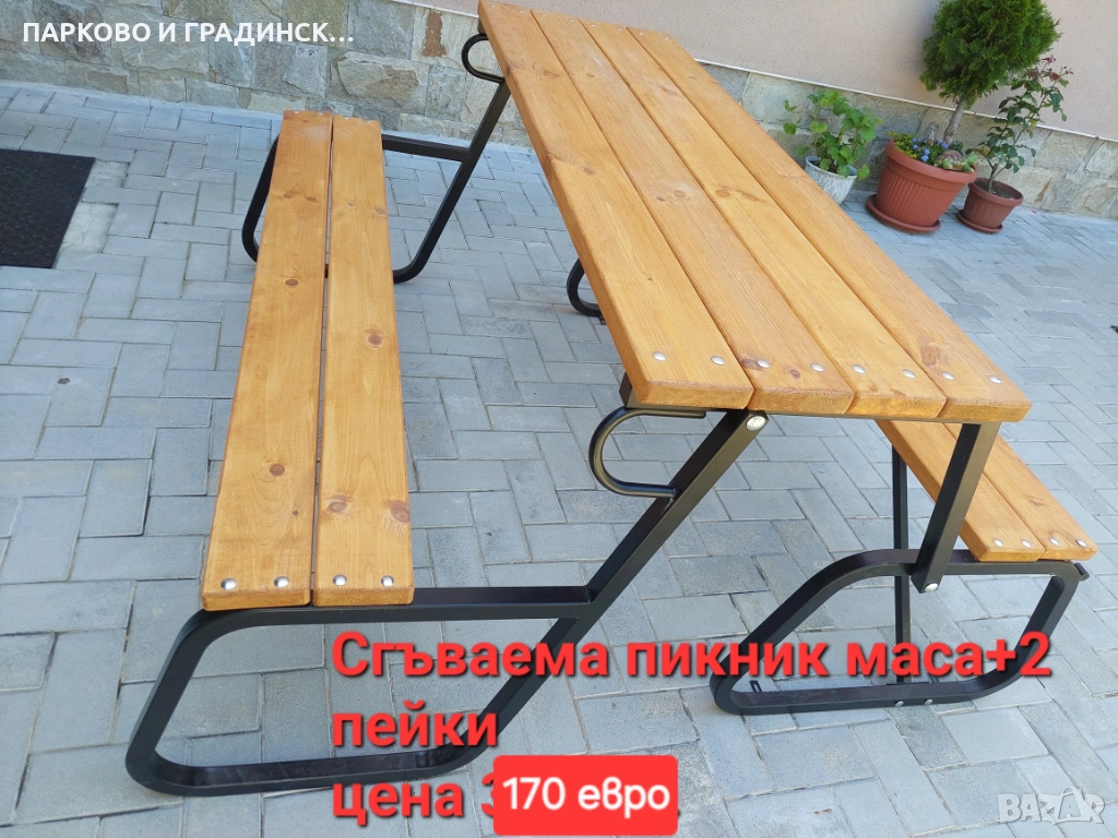 Сгъваема маса+пейка Дължина 150 см. Ширина на пейка 75 см. Ширина на разгънато полужение 150 см. Вис → Обява 46418396