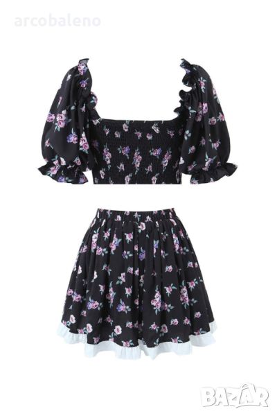 Дамски комплект бяло горнище с буф ръкави и висока талия на цветя + комплект пола