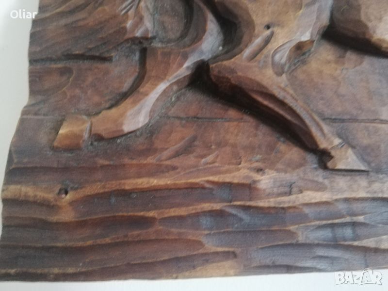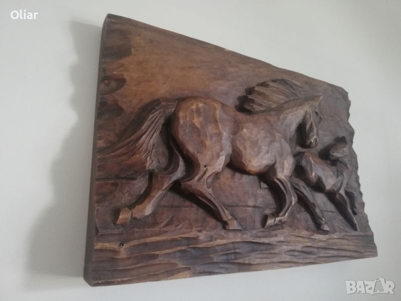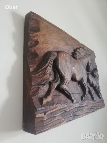 Изключително красива, масивна и детайлно изработена дърворезба.. Коне. Много впечатляваща декорация, акцент или подарък. Размер 41 на 30 см. Ширината на дървената плоча е 4.5 см. Моля погледнете и останалите ни обяви!