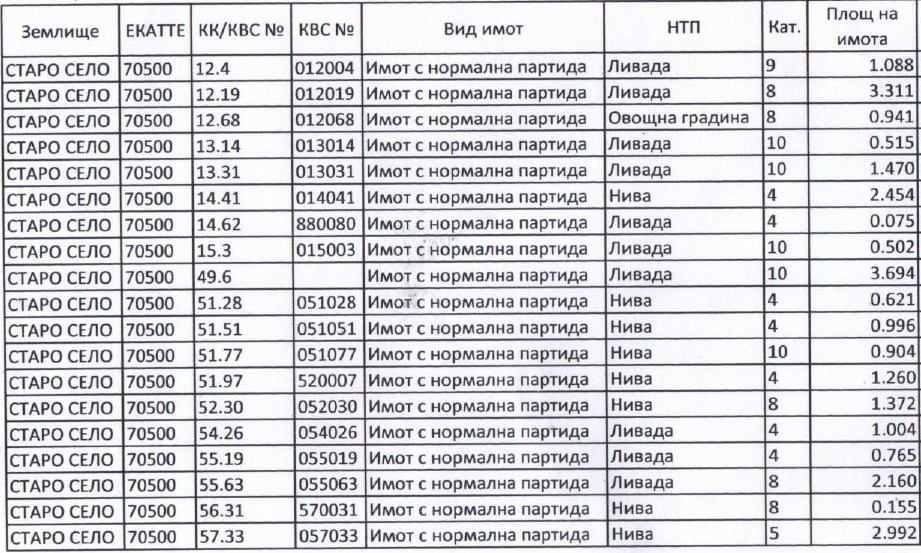 Продава!!! 19 броя земеделски земи с обща площ 26 272 кв.м. находящи се в землището на село Старо село, община Троян. Земите се продават заедно и поотделно !!! Поради неуточнение на имотите е необходимо предварителна уговорка за оглед и локация . В приложената таблица са упоменати идентификаторите, начина на трайно ползване, категорията и площа на земите. Референтен номер: 493