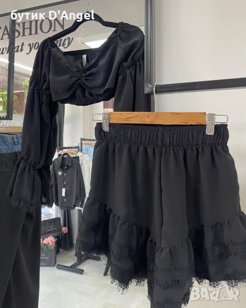 Къс топ с набор и пола-панталонки с ластик в талията.