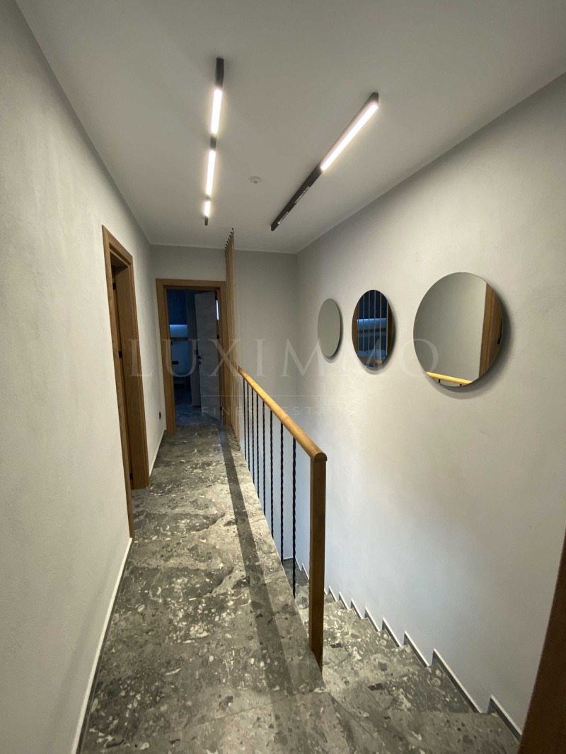 Към второто ниво води атрактивно стълбище, където са разположени коридор, три спални с три бани, две тераси.