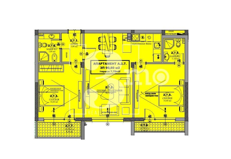 Предложеният Апартамент 2,7 е тристаен и е със следното разпределение: дневна с кухненски бокс, две спални помещения всяко излаз на тераса, две санитарни помещения и входно антре.
