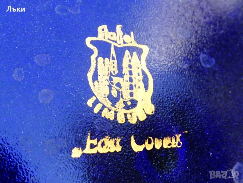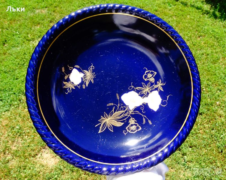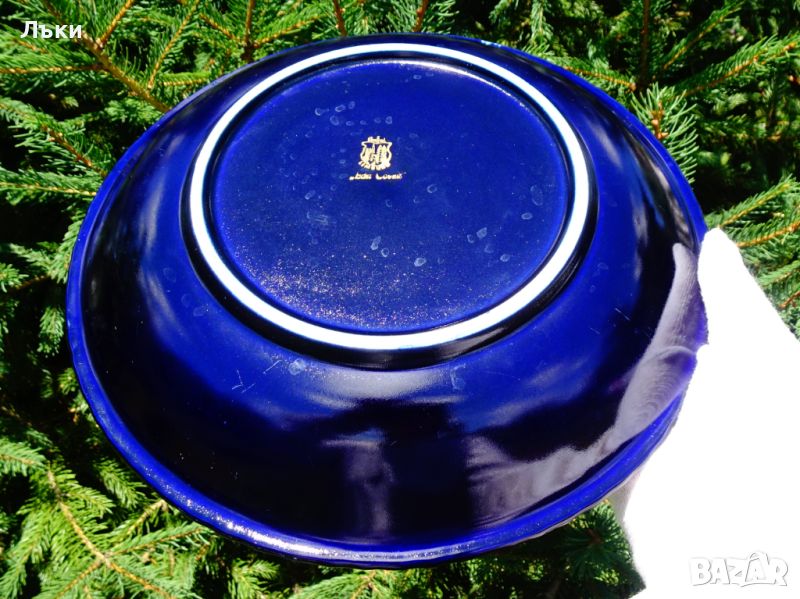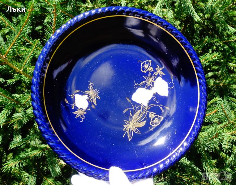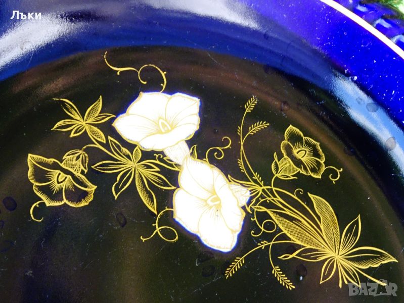 син кобалтов фон.Има златна маркировка за произход Staffel Limburg Echt Cobalt.Датира от 1960 година.Диаметър 26.5 см.,височина 4.5