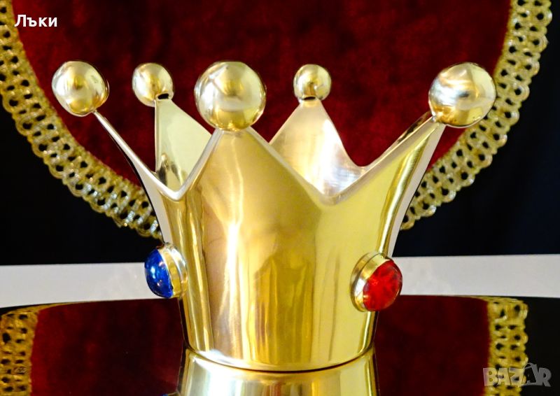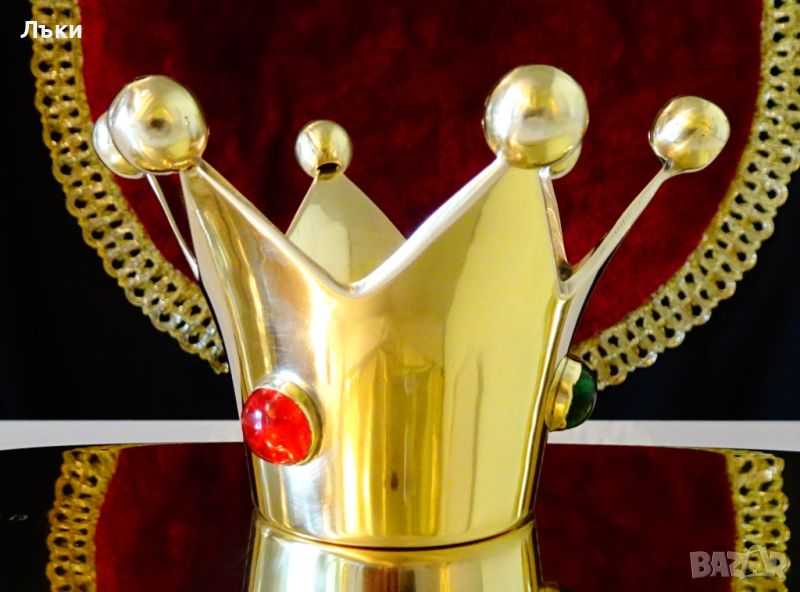 качествен бронз със златен блясък.Декориран с вградени ръчно шлифовани тип кабошон скъпоценни камъни – рубин,сапфир и смарагд.Височина 7 см.,диаметър 11 см.,тегло 180 гр.