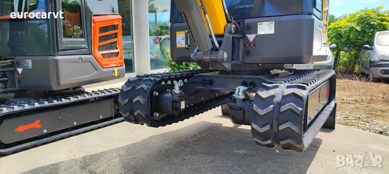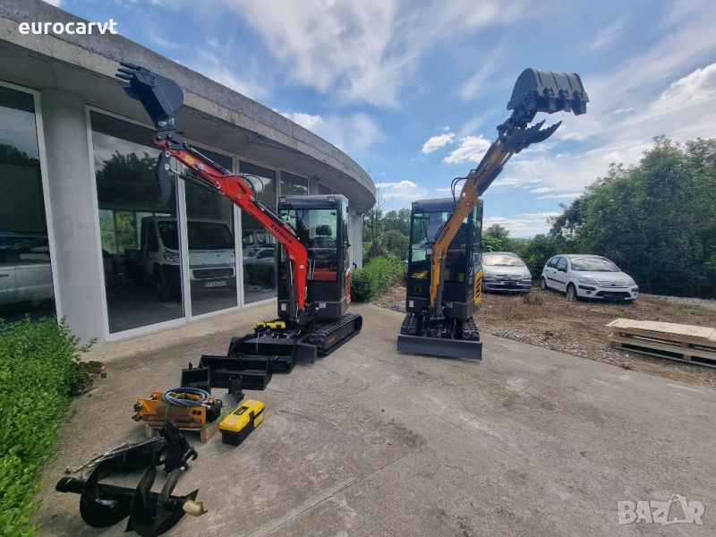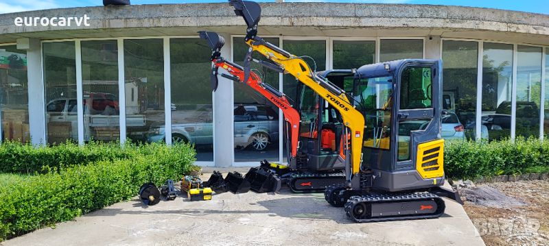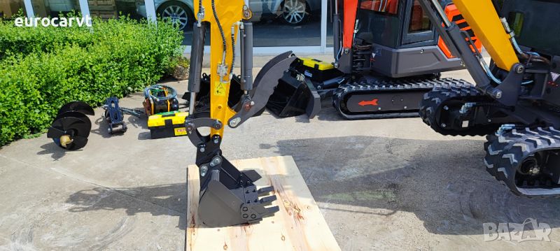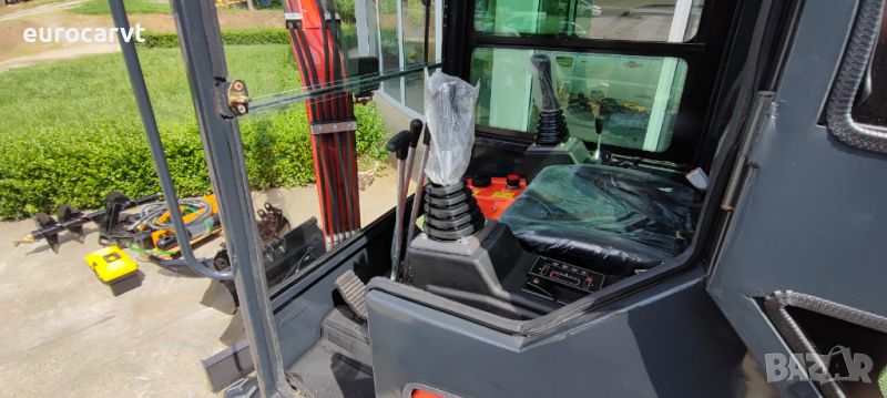 1800 кг.+кабина = 2000 кг., управление с джойстици, чупеща стрела, гребло, хидравличен палец, кофа 40 см, хидравличен изход за управление на хидравличен инвентар, три цилиндров дизелов двигател Laidong 385 euro 5, с водно охлаждане 19kw. CE сертификат, гумени вериги ***ЧИСТО НОВ*** 03/2024г.