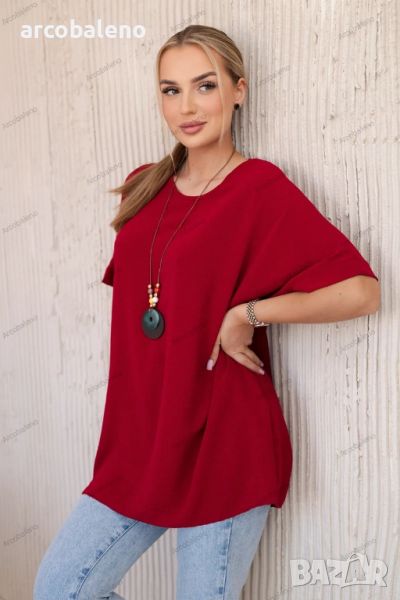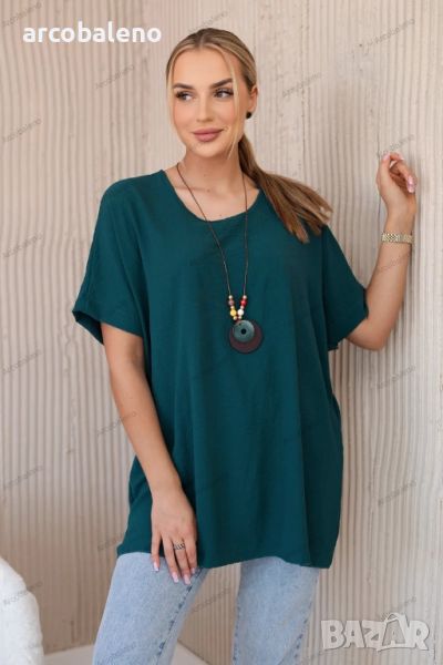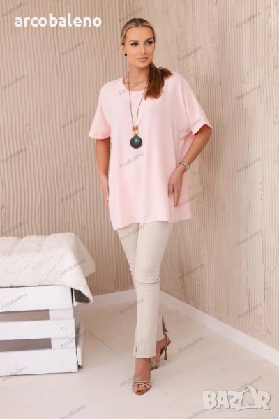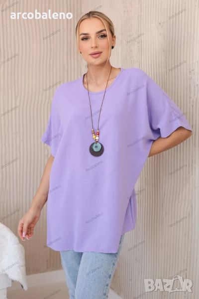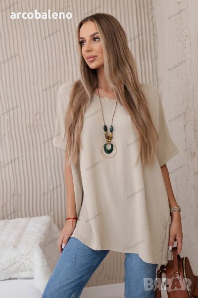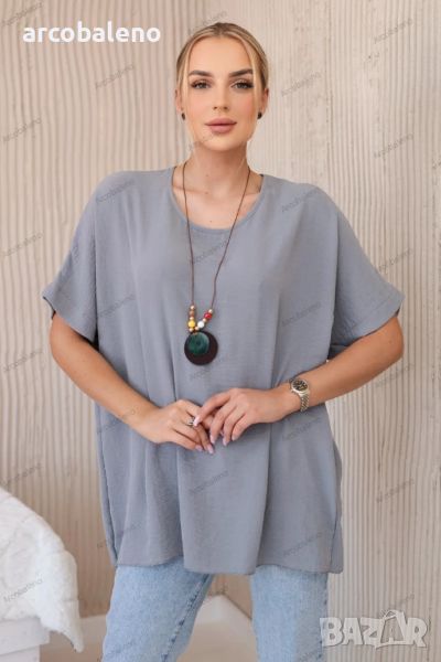 Овърсайз блуза с висулка е комбинация от небрежност и фина елегантност. Изработена от удобна и мека материя, тази блуза осигурява изключителен комфорт при носене. Голямата му кройка придава свобода на движенията, а висулката, поставена на деколтето, придава деликатен чар и изразителност. Перфектна за ежедневни излизания или срещи с приятели, тази блуза ще ви накара да се почувствате специални и спокойни, като същевременно е модерно допълнение към вашия гардероб. Размерът е универсален и ще бъде подходящ за жени, носещи размер S, M или L.