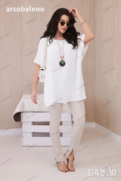 Овърсайз блуза с висулка е комбинация от небрежност и фина елегантност. Изработена от удобна и мека материя, тази блуза осигурява изключителен комфорт при носене. Голямата му кройка придава свобода на движенията, а висулката, поставена на деколтето, придава деликатен чар и изразителност. Перфектна за ежедневни излизания или срещи с приятели, тази блуза ще ви накара да се почувствате специални и спокойни, като същевременно е модерно допълнение към вашия гардероб. Размерът е универсален и ще бъде подходящ за жени, носещи размер S, M или L.