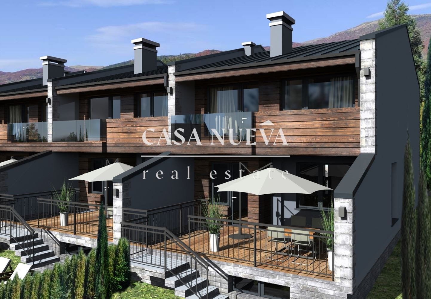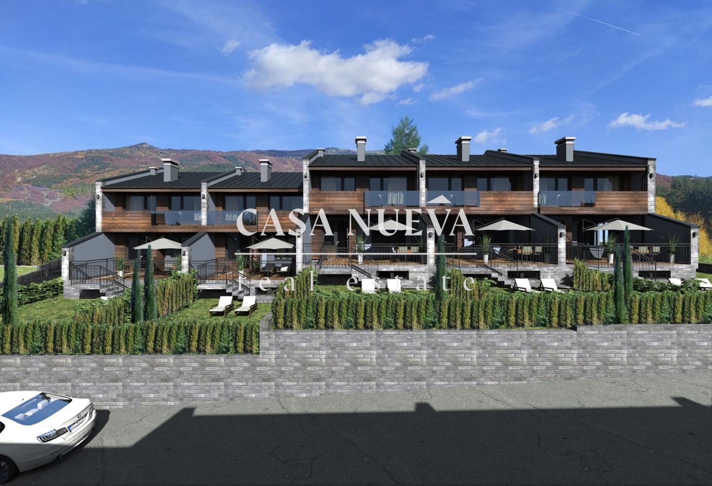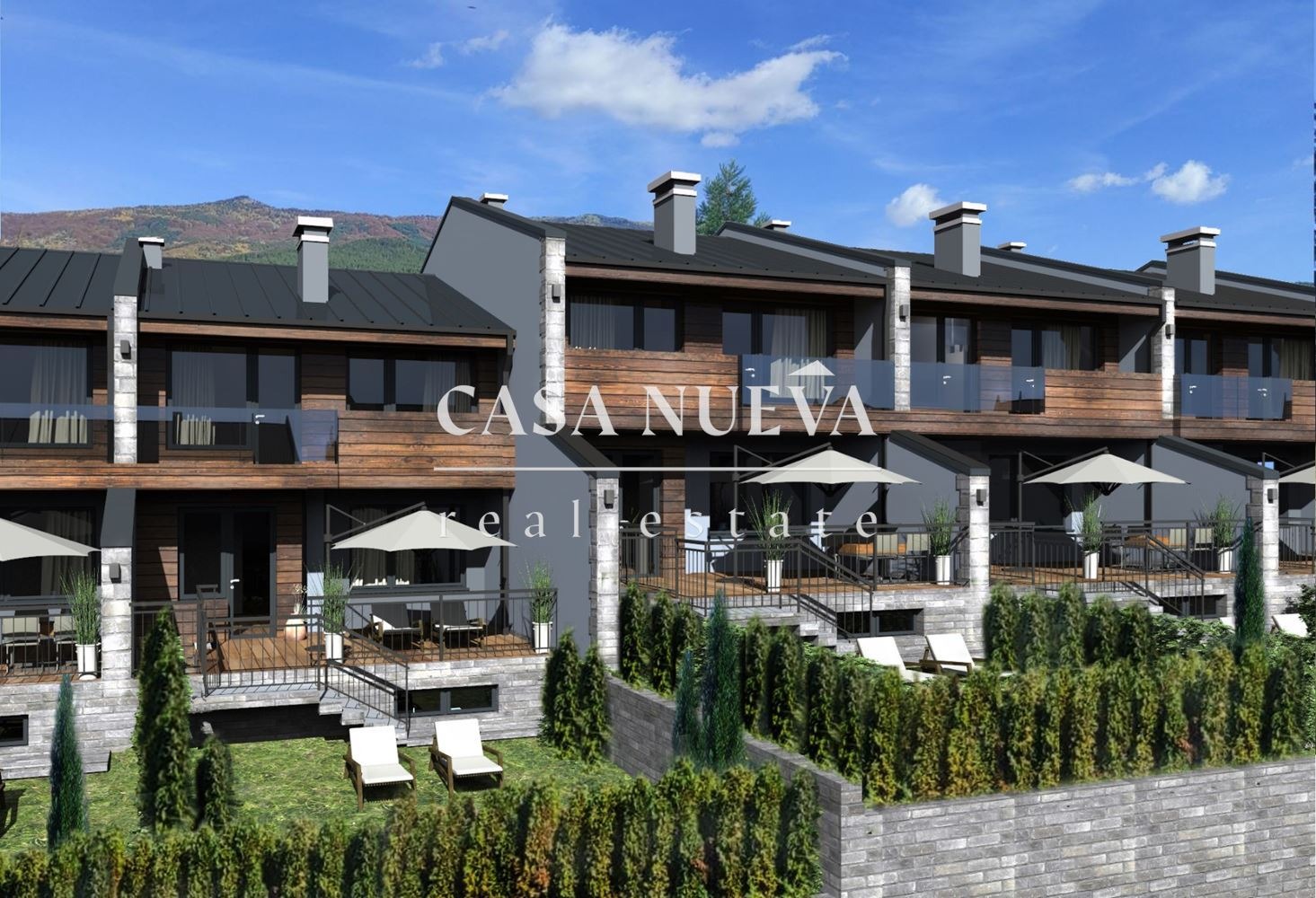 CASA NUEVA REAL ESTATE предлага на Вашето внимание къща в затворен комплекс в с.Рударци, област Перник. Тя е с разгъната застроена площ от 222,7 кв.м. и има следното разпределение: Първи етаж - антре, дневна с кухня, тоалетна за гости, кабинет, тераса към двора;Втори етаж - основна спалня с дрешник и баня, две спални, баня, мокро помещение, тераса. Към нея има и подземно мазе, двор от 134,2 кв.м. и две паркоместа. Къщата ще бъде издадена на шпакловка и замазка.