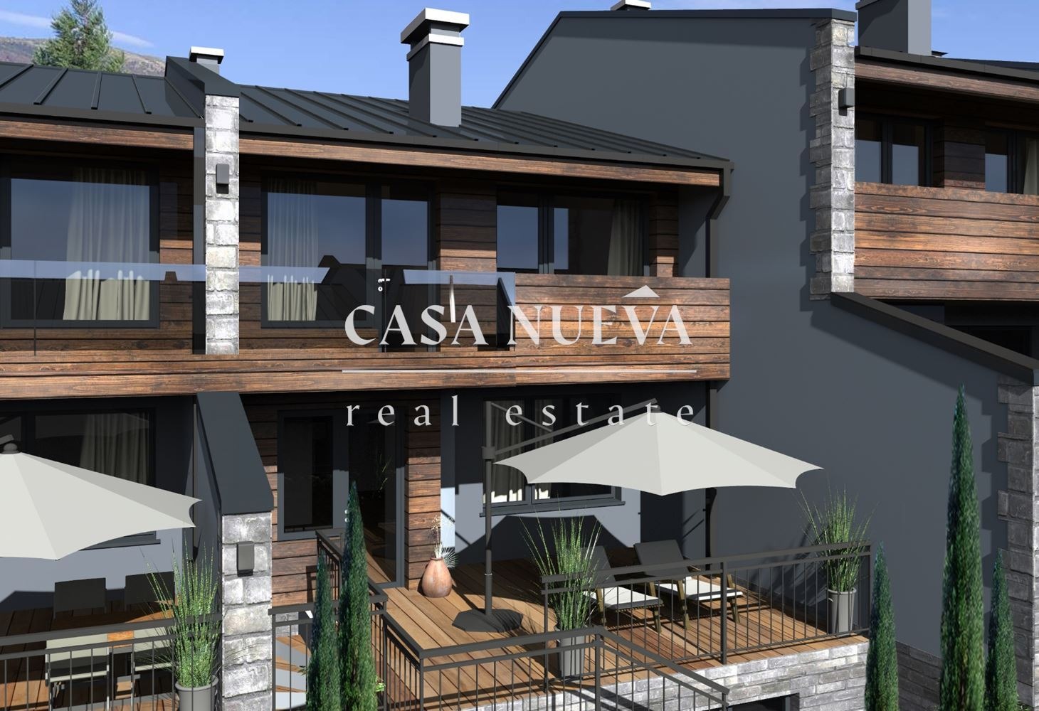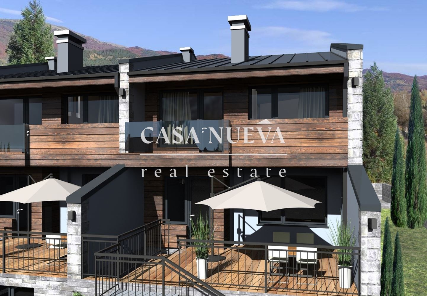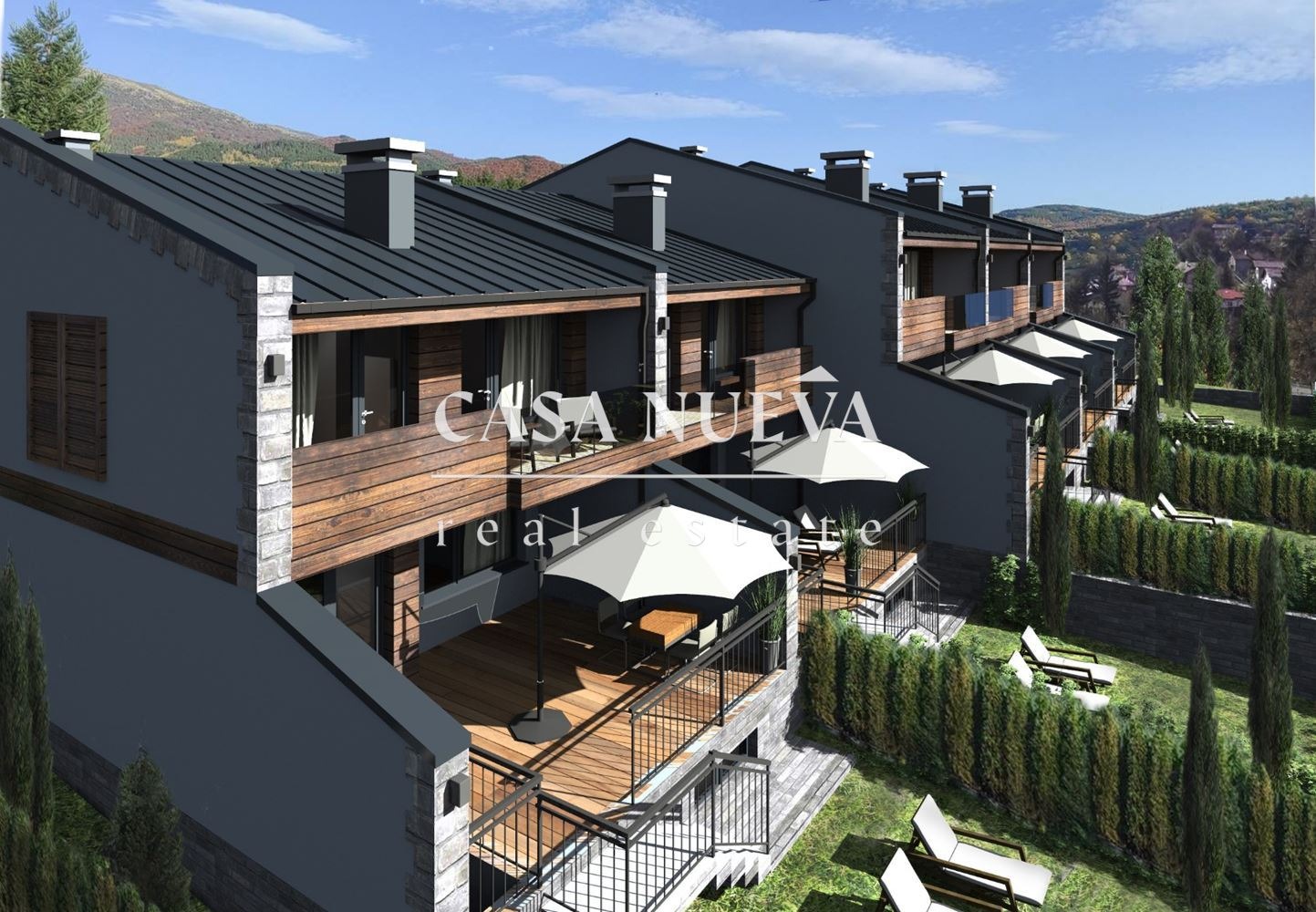 CASA NUEVA REAL ESTATE предлага на Вашето внимание къща в затворен комплекс в с.Рударци, област Перник. Тя е с разгъната застроена площ от 222,7 кв.м. и има следното разпределение: Първи етаж - антре, дневна с кухня, тоалетна за гости, кабинет, тераса към двора;Втори етаж - основна спалня с дрешник и баня, две спални, баня, мокро помещение, тераса. Към нея има и подземно мазе, двор от 134,2 кв.м. и две паркоместа. Къщата ще бъде издадена на шпакловка и замазка.