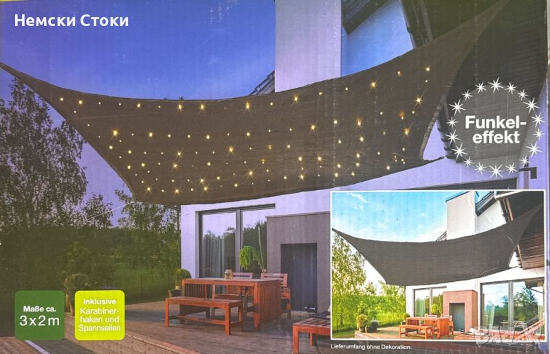 Соларла LED тента "звездно небе" триъгълна, правоъгълна Германия, снимка 1 - Градински мебели, декорация  - 46432034 Соларла LED тента "звездно небе" триъгълна, правоъгълна Германия, снимка 2 - Градински мебели, декорация  - 46432034 Соларла LED тента "звездно небе" триъгълна, правоъгълна Германия, снимка 3 - Градински мебели, декорация  - 46432034 1/3