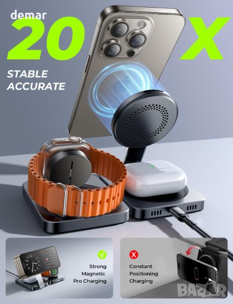 LISEN 3 в 1 станция за безжично зареждане за iPhone 15/14/13/12 AirPods, Magsafe сгъваемо зарядно