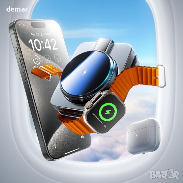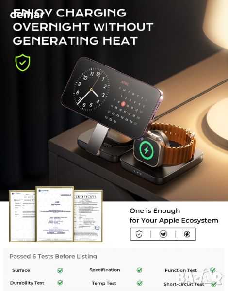 3-в-1 Travel Essentials за устройства на Apple е удобно зарядно устройство MagSafe за iPhone, Apple Watch и AirPods, идеално за организиране на пространства като дома, офиса, хотела или заседателни зали. Той елиминира заплетени кабели и разхвърляни кабели, осигурявайки спретнато и ефективно решение за зареждане. Сгъваемата безжична станция за зареждане захранва сериите iPhone 15 Pro Max и 14/13/12 с мощност до 15 W с безпроблемно магнитно подравняване. Разполага с автоматично спиране на зареждането на 100%, гарантиращо здравето на батерията, и включва защита срещу прегряване, свръхток, свръхнапрежение и късо съединение за безопасно зареждане. Този ултракомпактен преносим куб за зареждане се побира лесно в дланта или джоба ви, което го прави идеален за пътуване. Има регулируем ъгъл на височина и се сгъва в компактен куб, служейки като стилен аксесоар за работния плот. Дизайнът против приплъзване осигурява безопасно зареждане и поддържа iPhone използване както хоризонтално, така и вертикално. Подходяща за iPhone 15/14/13 Pro/Max, тази зарядна станция се трансформира в нощно шкафче с три режима на бързо зареждане, което я прави идеален подарък.