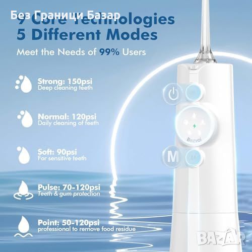 Силно водно налягане (50-150 PSI): Ефективно премахва 99.9% от зъбния налеп.