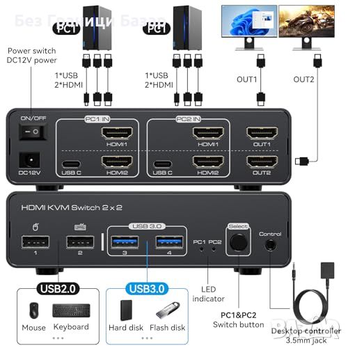 Нов 8K60Hz KVM Switch за 2 Монитора и 2 Компютъра HDMI 4 USB Устройства