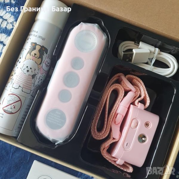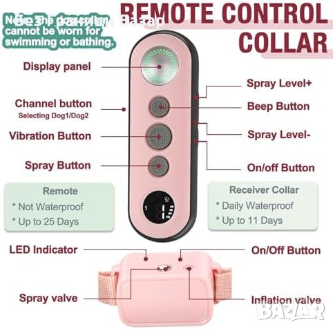 Включени аксесоари: Нашийник, дистанционно, кутия със спрей, USB кабел и ръководство