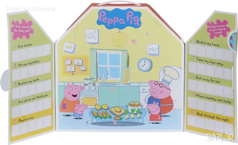 Наградната класация Peppa идва като прекрасна къща на Peppa Pig с дръжка за носене. Отворете вратите, за да намерите таблицата с награди и стикерите вътре. Има 10 врати със скрити награди за откриване!
