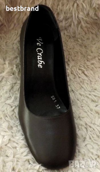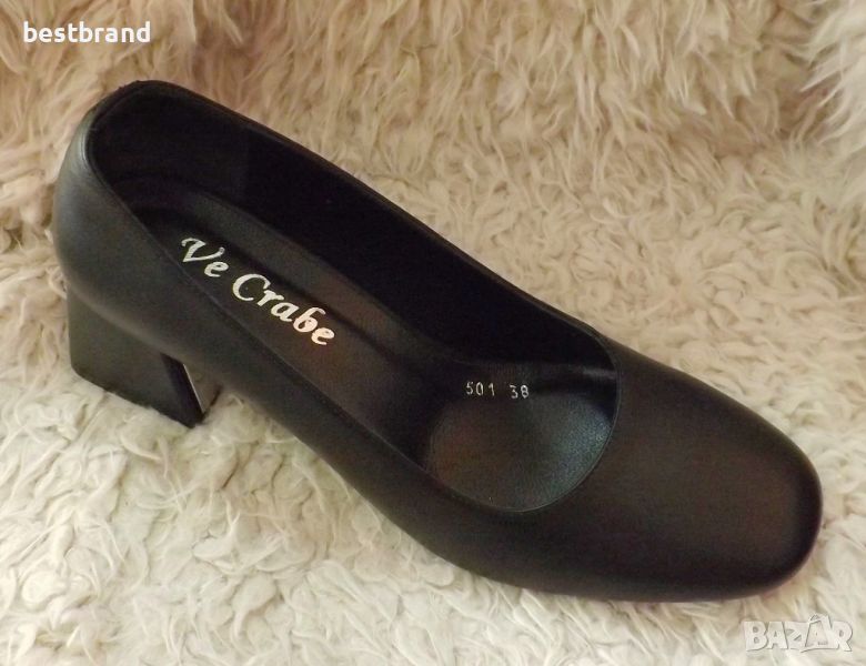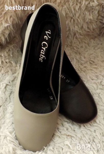Дамски обувки на ток , от естествена кожа в три цвята- черно, бежово, и кафяво. Височина на тока 6 см. Удобна стелка,която следва извивката на ходилата, и стабилен , широк, не много висок ток, с огледален елемент от вътрешната страна. Моделът си отговаря на номерата. Цветове: