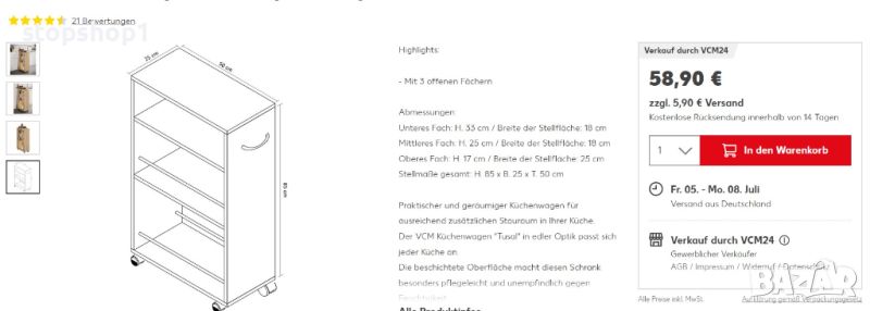 Общи размери: H. 85 x W. 25 x D. 50 cm