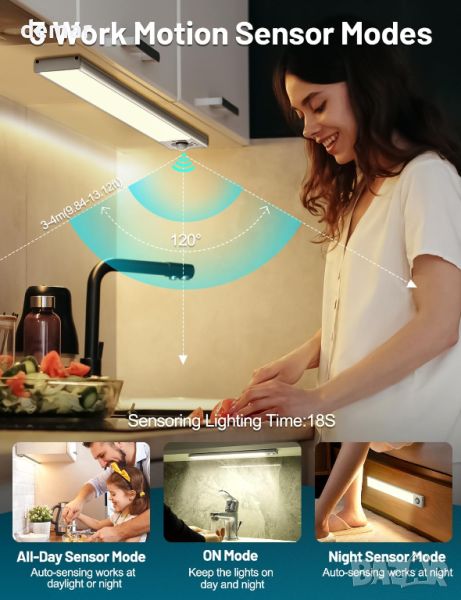 Кухненските лампи под шкафа предлагат три режима на цветова температура (3000K, 4000K, 6000K) и регулируема яркост от 5%-100% с кратко или дълго натискане на бутона за настройка. Те идват с дистанционно управление, което работи в обхват от 3 метра и 120° ъгъл на засичане, което ви позволява да променяте цвят, яркост и да настройвате таймери. Има три режима на работа: ВКЛ., Целодневен сензор и Нощен сензор. Оборудвани със 72 светодиода (36 топли и 36 студени) и 3000mAh акумулаторна батерия, тези светлини осигуряват ярко осветление и до 1-2 месеца автоматично разпознаване или 8-9 часа постоянна употреба. Лесни за инсталиране с вградени магнити или самозалепващи ленти, тези светлини са идеални за различни вътрешни помещения като спални, бани, стълбища и пътеки.