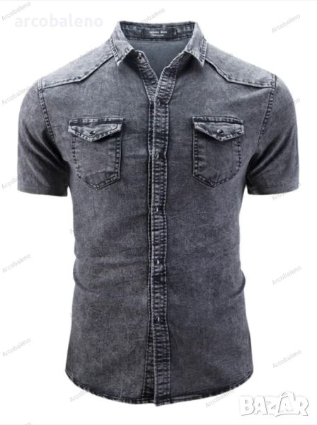 Нова мъжка едноцветна дънкова риза с джобове и къс ръкав