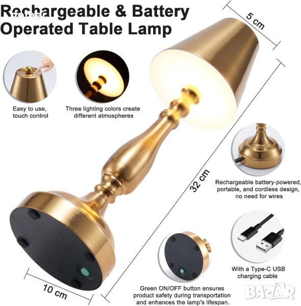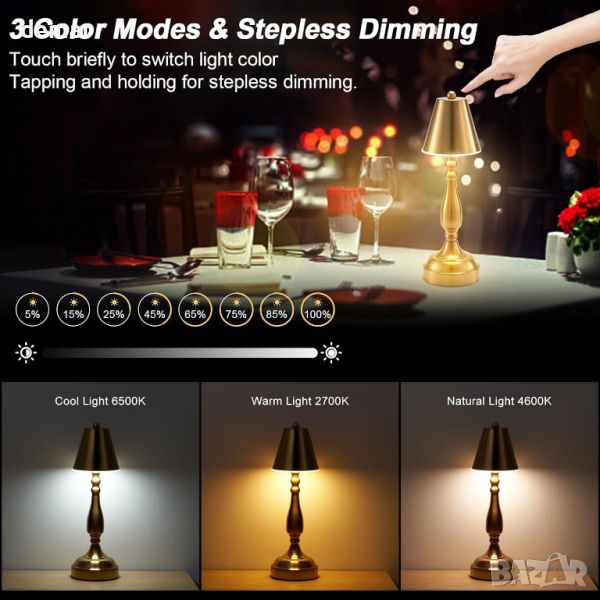 Тази акумулаторна настолна лампа разполага с батерия от 4000 mAh за 10-48 часа безжична употреба след пълно зареждане, в зависимост от настройките на яркостта. Неговото издръжливо, устойчиво на избледняване метално тяло с усъвършенствано галванично покритие позволява поставяне навсякъде, идеално за къмпинг, атмосфера на маса за вечеря или нощни шкафчета за детска стая. Предлага 3 цвята на осветление (студено, топло и естествено) с безстепенно затъмняване чрез сензор за докосване в абажура. Лампата включва 40 ярки LED мъниста и ретро дизайн с тежка основа и акрилен дифузионен панел за мека, нетрептяща светлина. Зарежда се през универсален Type-C порт