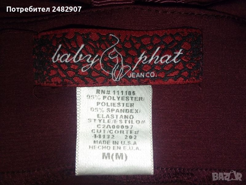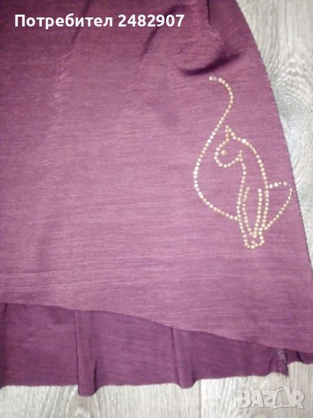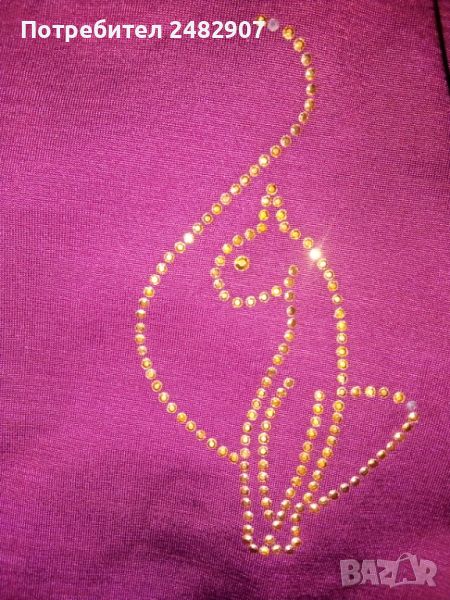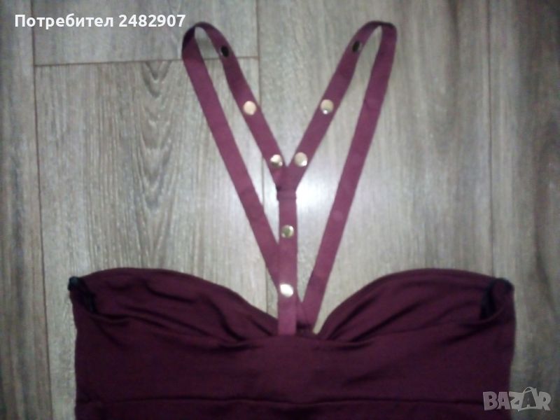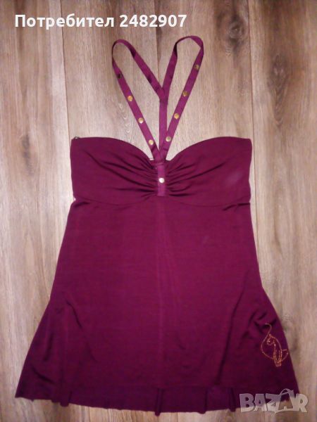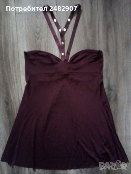 Ефектна дамска туника - цвят Бордо, размер М. Съдържа 95 % полиестер и 5 % еластан. Ширина под мишниците - 40 см, ширина в долната част - 72 см, дължина от под мишниците до долу - 59 см. Много запазена, почти не е използвана, много тънка и приятна на допир, с малки блестящи златисти камъчета. Без забележки.