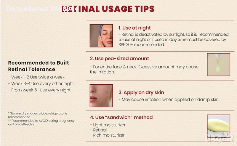 1. След почистване и тонизиране преди лягане, нанесете количество колкото грахово зърно върху кожата като част от вашата рутинна грижа за кожата през нощта.