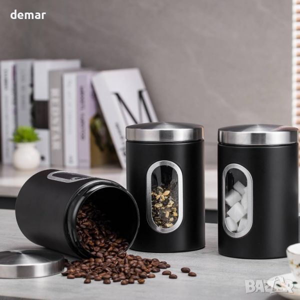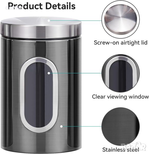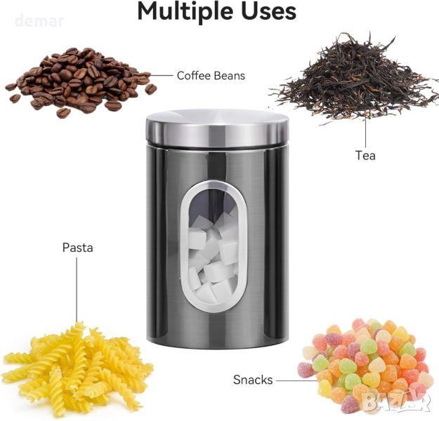 Бурканите за съхранение на храна Simcat са изработени от издръжлива, висококачествена неръждаема стомана и разполагат с херметичен капак, който се завинтва, за да поддържа храната свежа и защитена от влага. Тези буркани могат да се поставят в кухнята, хола или кабинета, без да се притеснявате, че ще се счупят. Комплектът включва три контейнера, всеки с размери 4,33"/11CM(L) x 6,69"/17CM(H), идеални за съхранение на чай, кафе, бонбони, бисквитки, юфка и други, но не са подходящи за течности. Всеки буркан разполага с ясен прозорец за преглед, за да видите лесно съдържанието и да наблюдавате количествата. Универсални и удобни, тези буркани могат да се използват като контейнери за чай, кафе или юфка и се почистват лесно с влажна кърпа.