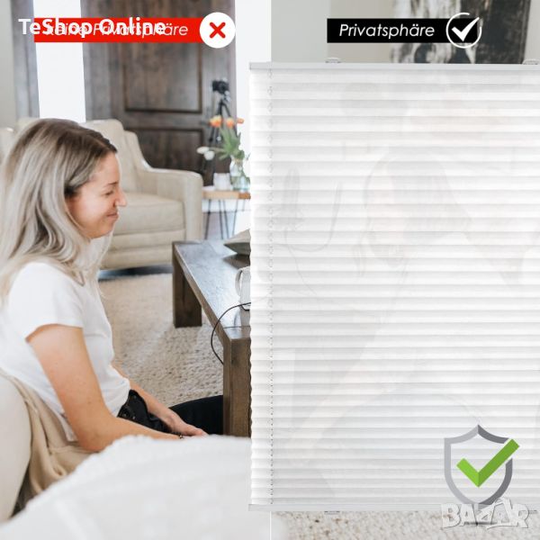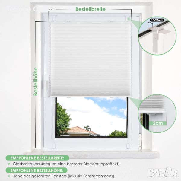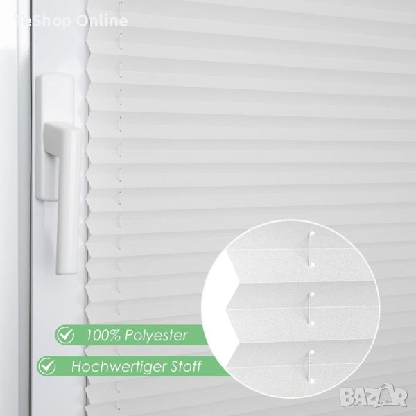 Онлайн магазин ”TeShop” продава:Плисирана щора Bobodeco без пробиване, сгъваема ролетна щора Klemmfix, бяла 50 x 210 смПлисиранa щорa 100% полиестер, леснa за поддръжка, леснa за почистване и издръжливa, полупрозрачнaBързо и лесно сглобяване без пробиване. Това може да се захване директно върху крилото на прозореца с помощта на регулируеми скоби.Меките прозрачни тъкани позволяват на дневната светлина да блести. Поверителност и защита от слънце. Като дърпате дръжката нагоре и надолу, можете свободно да регулирате позицията на сенките.С дръжката можете лесно да плъзгате ролетната щора нагоре и надолу, за да регулирате оптималната защита от слънцето и неприкосновеността на личния живот според вашите нужди. Ролетната щора не се люлее, тъй като KlemmFix може да се захване здраво към крилото на прозореца. Щората е идеална за хол, офис, бизнес помещение, кухня, детска стая, баня, кабинет, балконска врата,