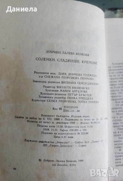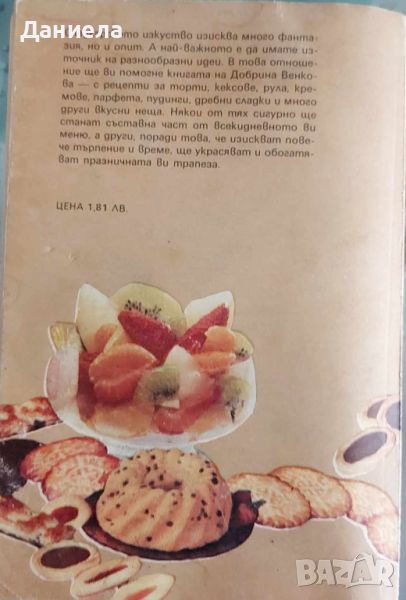 Соленки, сладкиши, кремове- Добринка Венкова. Издадена 1988.184стр. Книгата е в много добро състояние- няма драскано и скъсано.Изпращам със Спиди и Еконт. За бърза връзка съм дала телефонен номер.