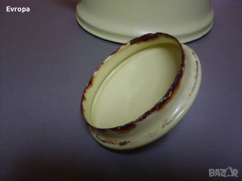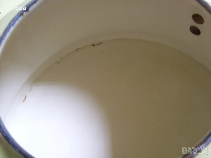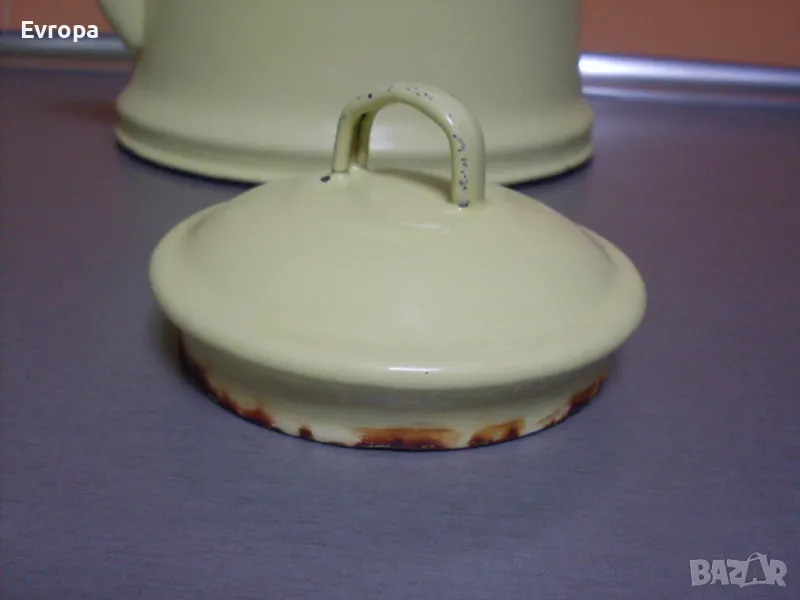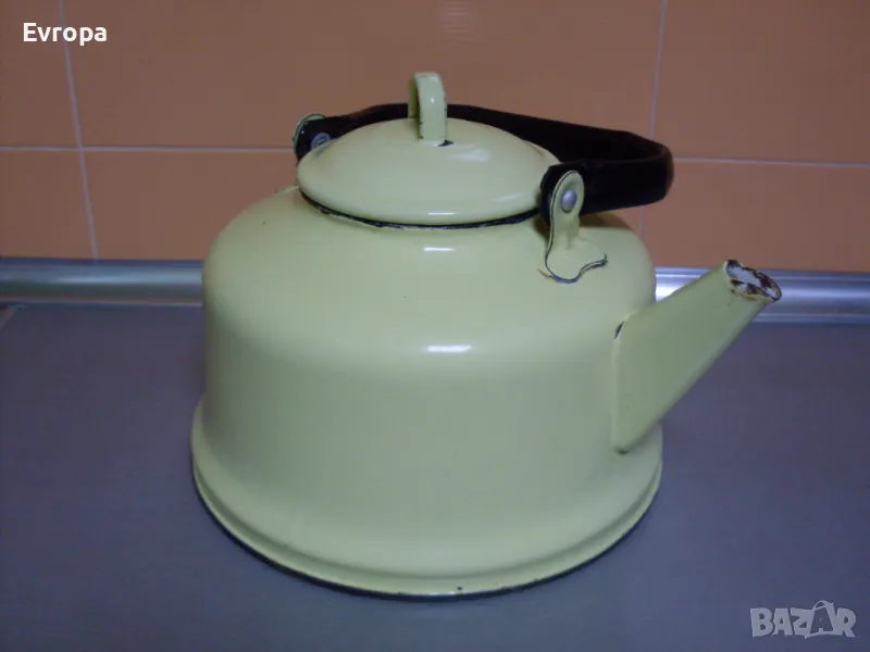 Стар емайлиран чайник от миналия век в добро състояние, с нормални следи от употреба. Може да се ползва още толкова години, на колкото е или за декорация на механи и битови стаи или в градината. Вместимост- 3.5литра до горе.... Договаряне.... Предпочитам лично предаване, по куриер- първо изпращате част от договорената сума... Изпращам с опция "преглед и тест" и 10% отстъпка от куриерската услуга...