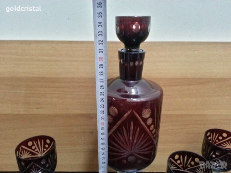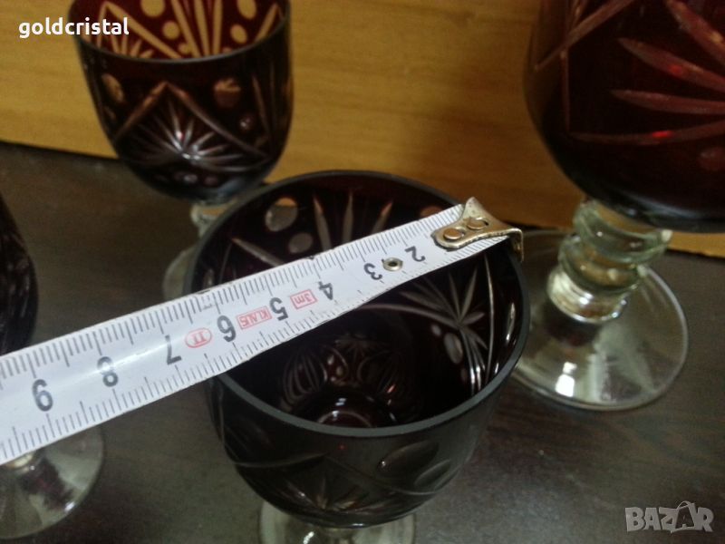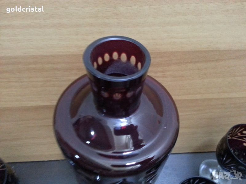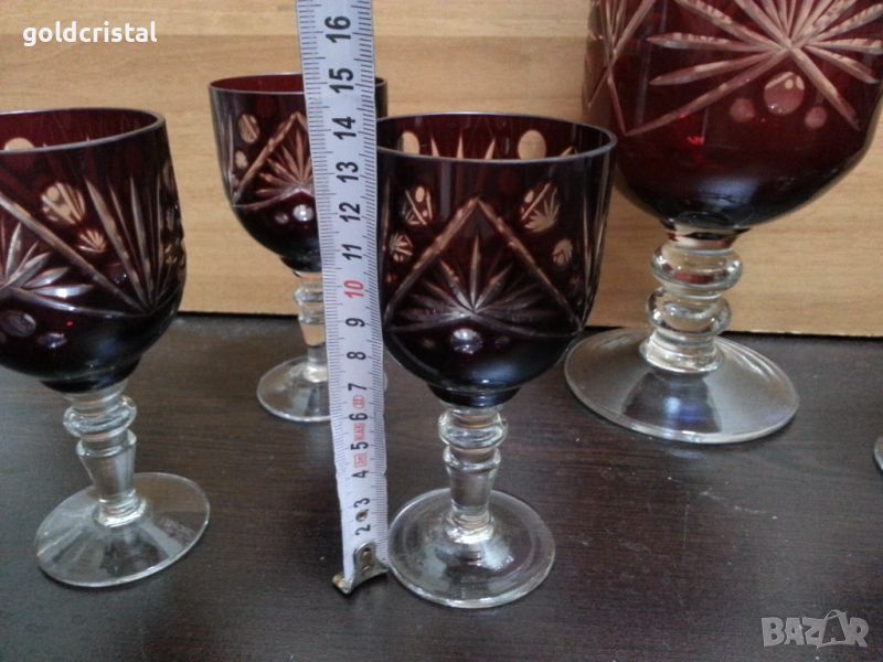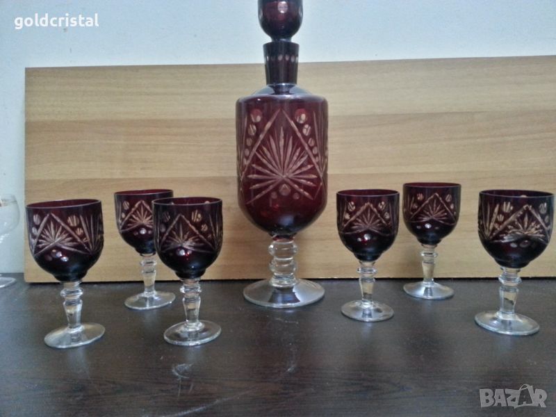 Великолепни кристални чаши и гарафа рубинено червен цветен кристал без забележки сервиз комплект сет лот ретро арт декор винтидж колекция стари старинни антикварни предмети обзавеждане за дома и семейството подходящи за подарък за ценители и колекционери