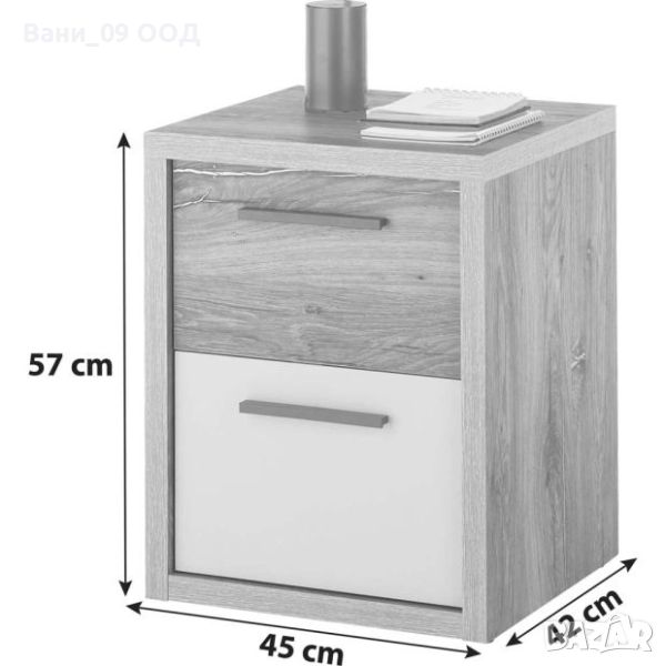 Нощно шкафче с чекмеджета с размери Ш:45/Д:42/В:57 см. Моделът се отличава със стилен дизайн и функционалност. Притежава атрактивна модерна визия с акцент към домашната естетика. Конструкцията на шкафчето е проектирано с компактен плот за поставянето на нощна лампа или друг аксесоар, както и 2 практични чекмеджета с графитени дръжки за съхранение на дреболийки в спалнята.