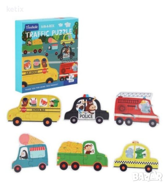 Комплект от 6 картонени пъзела, всеки с 6 големи части, лесни за боравене за най-малките.