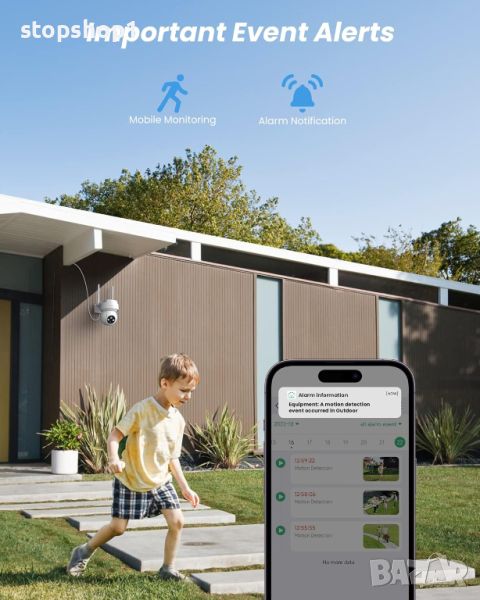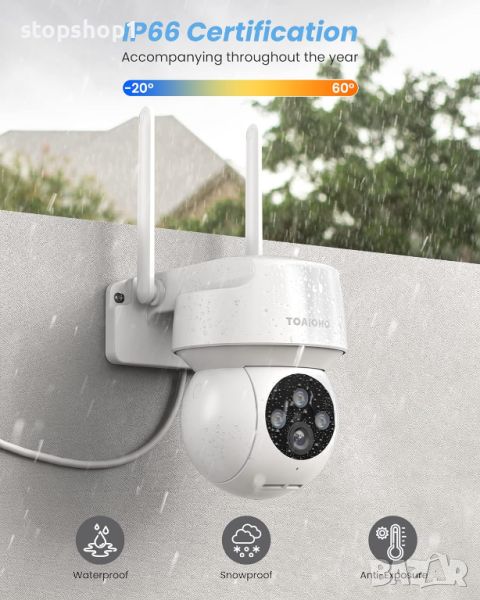 - 【Откриване на движение и звук & IP66】 Тази външна домашна камера може интелигентно да разпознава движение и звук. Камерата за сигурност отвън ще изпрати предупредително съобщение на мобилния ви телефон. Можете да регулирате чувствителността на алармата. Това намалява фалшивите аларми, причинени от листа, дъжд, обилен сняг и др. Има IP66 водоустойчив сертификат. До известна степен може да устои на екстремни метеорологични условия като силен дъжд и сняг.