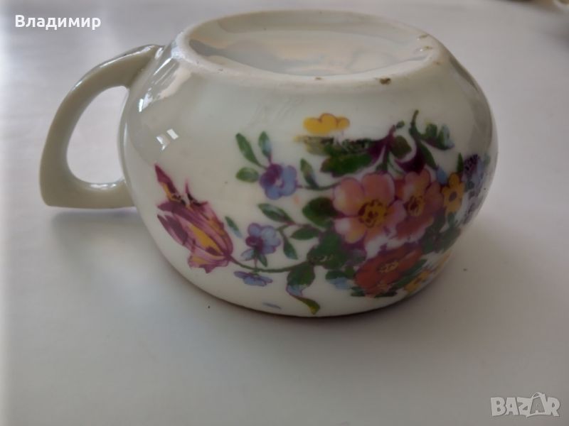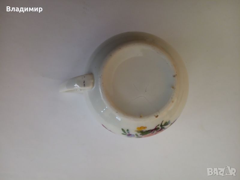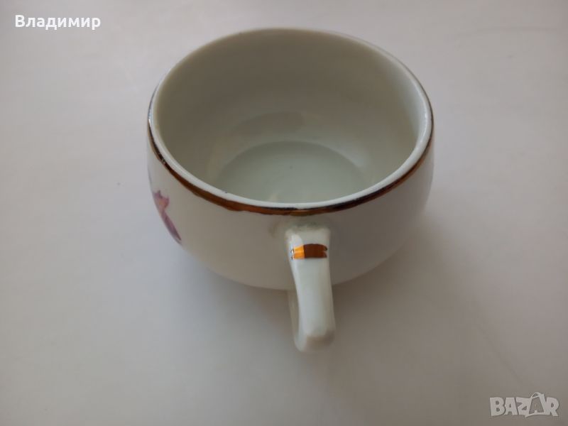 Продавам порцеланова чашка за кафе от 60-те години на миналия век със златен кант, красиви флорални мотиви от двете страни, вместимост- 60 мл. в много добро състояние видно от снимките.