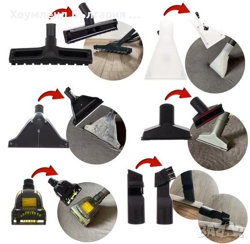 КАК РАБОТИ ИНДУСТРИАЛНАТА ПРАХОСМУКАЧКАТА ЗА СУХО И МОКРО ПОЧИСТВАНЕ И ИЗПИРАНЕ? - има система от два резервоара. Налейте вода и почистващ препарат в една от тях, а другата ще се напълни автоматично с използвана и мръсна вода. Резервоарът за препарат е с вместимост 3,5 литра, а този за мръсна вода след пране е с вместимост 20 литра. Комплектът включва 6 накрайника! Turbo накрайник за почистване на под е предназначен за почистване на гладки повърхности и килими, може да отстрани упорити замърсявания, като животински косми, благодарение на въртяща се ролка със синтетични събирателни елементи. Тясна дюза с подвижен връх е перфектна например за почистване на ъглите на дивани, первази, тавани и други кътчета. Малък Т-образен накрайник, идеален за изпиране и почистване на килими, мокети и тапицерии. Почистваща дюза с воден спрей, накрайник за пръскане и четка за под.