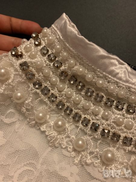Дантелена блуза с камъни по врата. Дължина на блузата - 50см. Ръкавите нямат подплата и са дантелени само. По етикет е С/М, но според мен е подходяща за С размер.