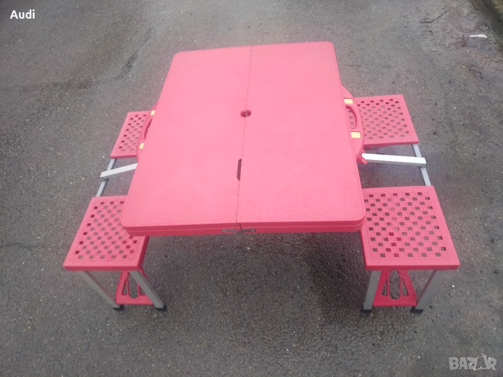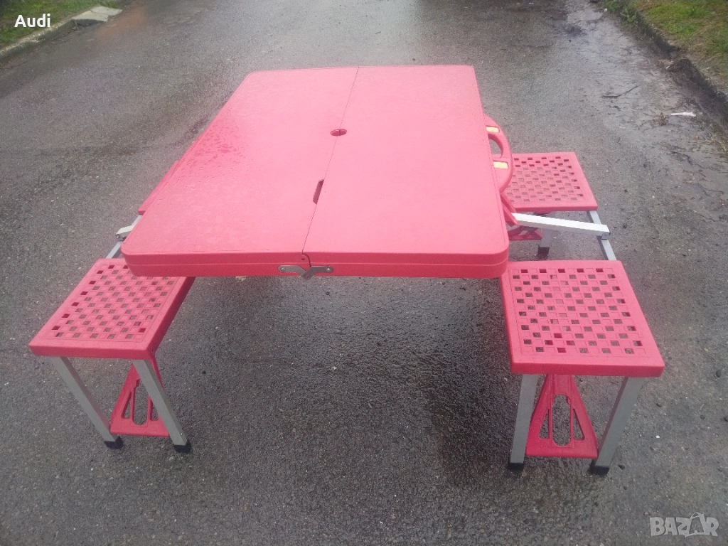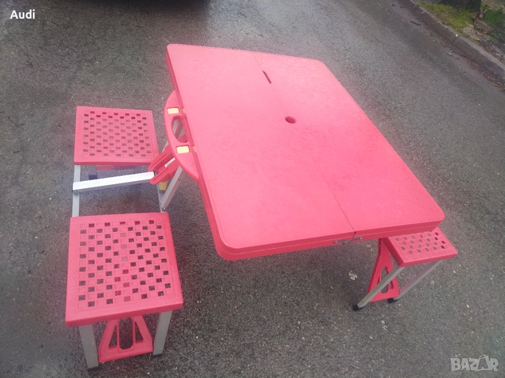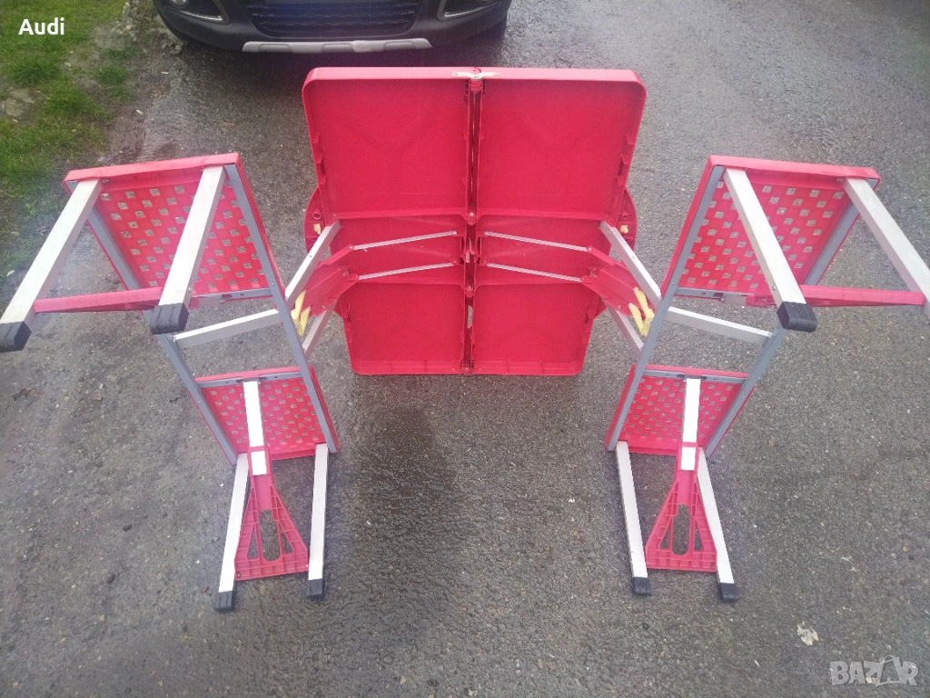 Сгъваема маса със столове за къмпинг, идеаллна за дворове, градини, пикници и др. Сгъва се във фор